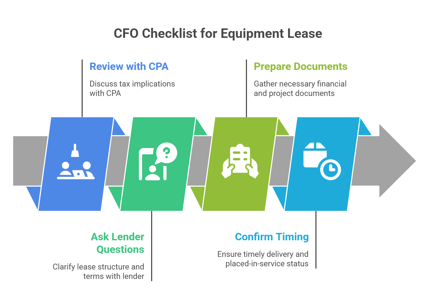 Here’s a practical checklist, based on our real-world underwriting experience, to help CFOs maximize both tax and operational benefits before finalizing any equipment lease.